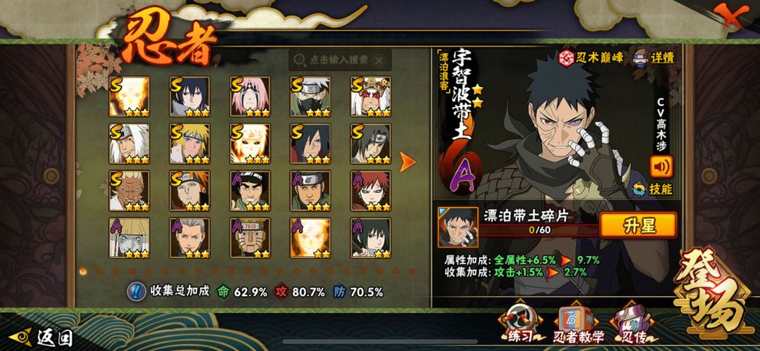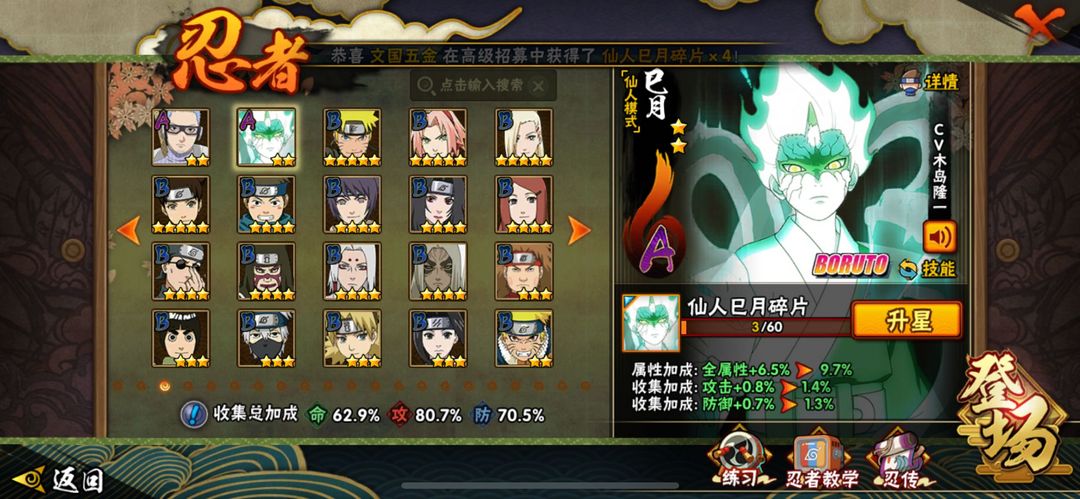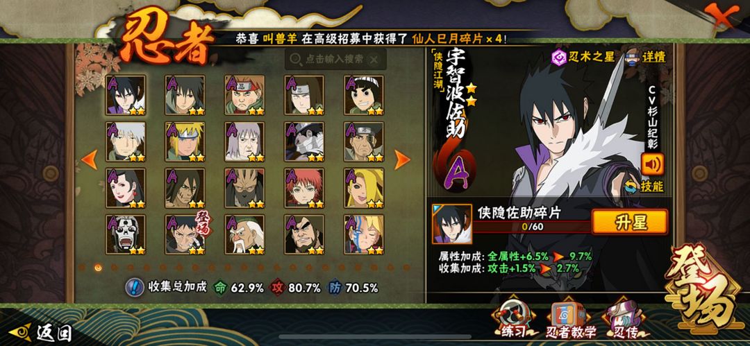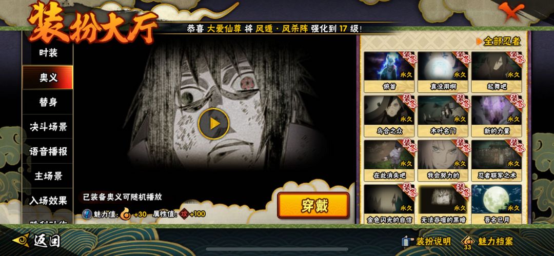 侠隐佐助/漂泊带土/金身水门/仙人巳月/解斑/秽土再不斩/传说自来也/忍战樱/须佐卡卡西/须佐佐助