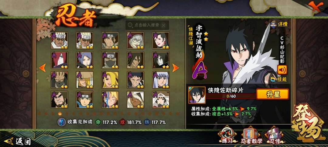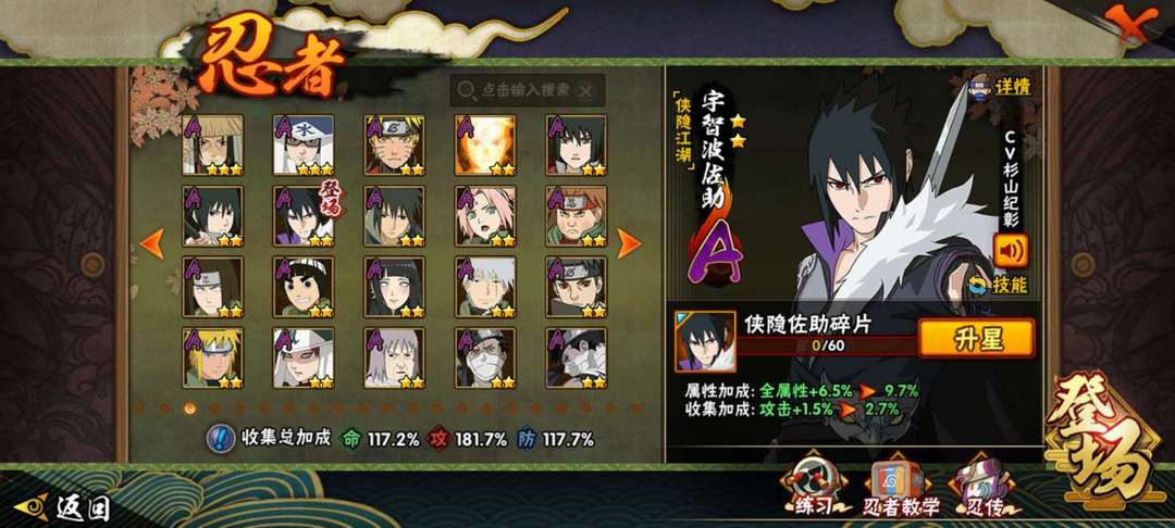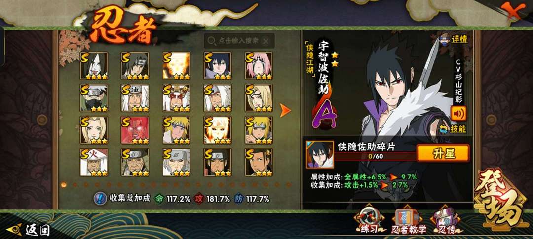 侠隐佐助九尾水门已秒重做解斑32S忍49A忍,漂泊带土,自来也,重做再不斩,百战鼬,热门忍者基本有