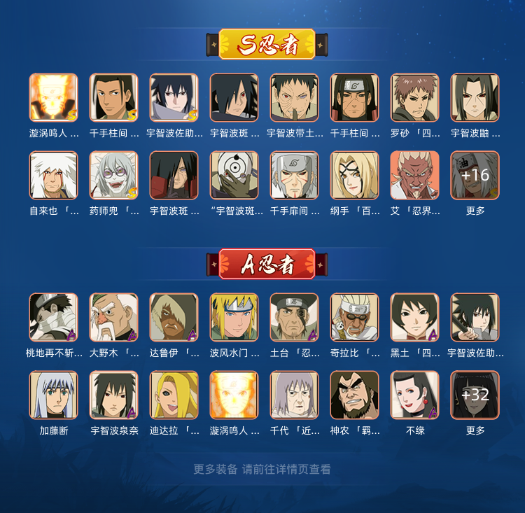 装备描述:侠隐佐助九尾水门已秒重做解斑32S忍48A忍,漂泊带土,自来也,重做再不斩,百战鼬,热门忍者基本有