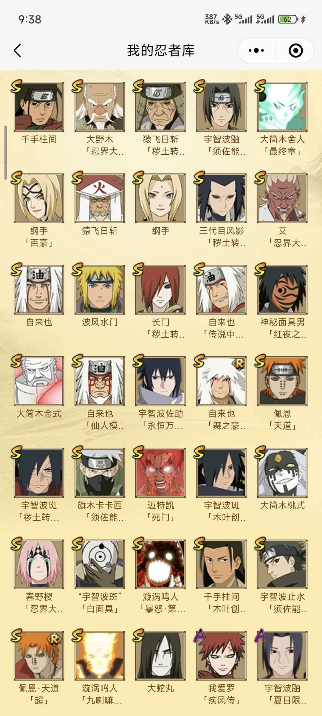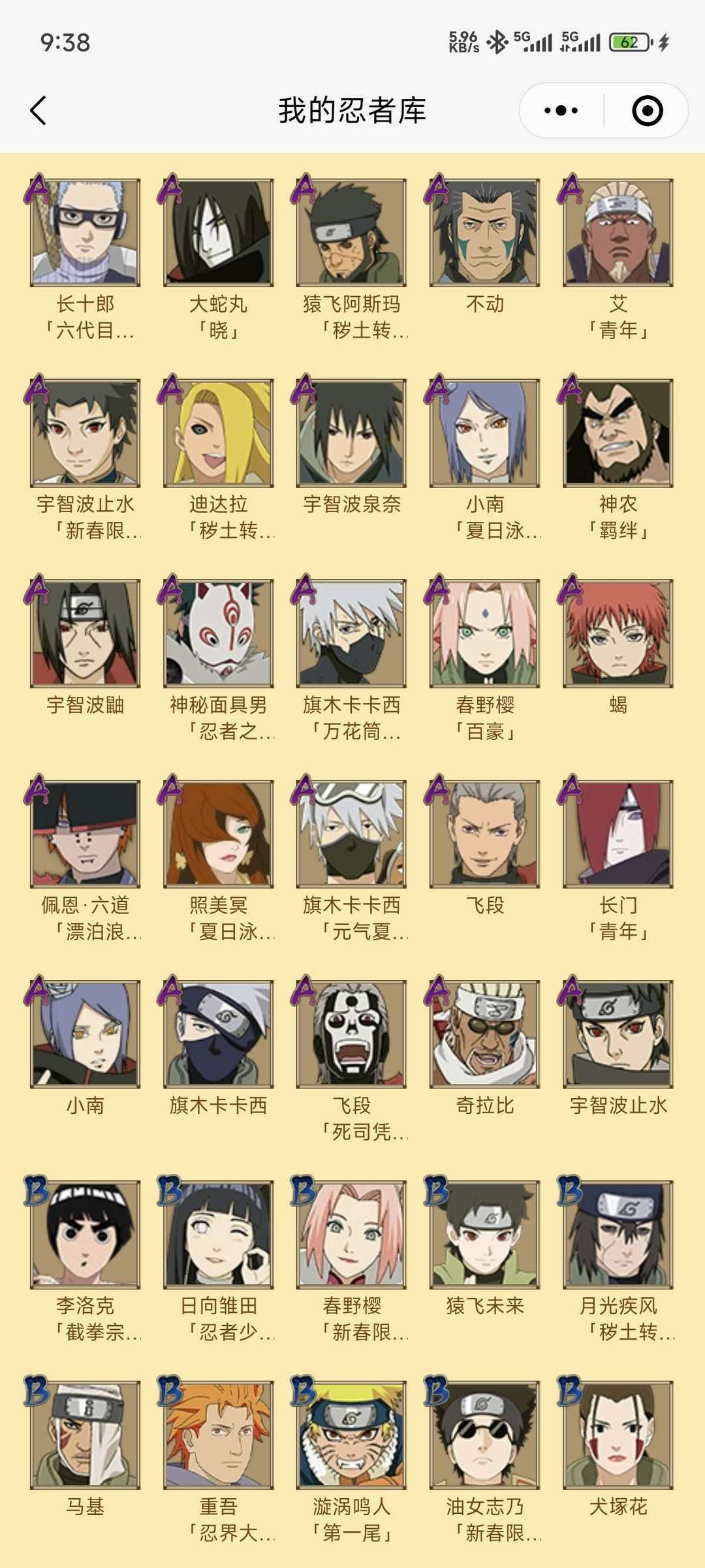 33S忍,62A忍,有天道超,白面具,面麻,漂泊全,侠隐兜,侠隐佐助,青春哥等,战力1650W+