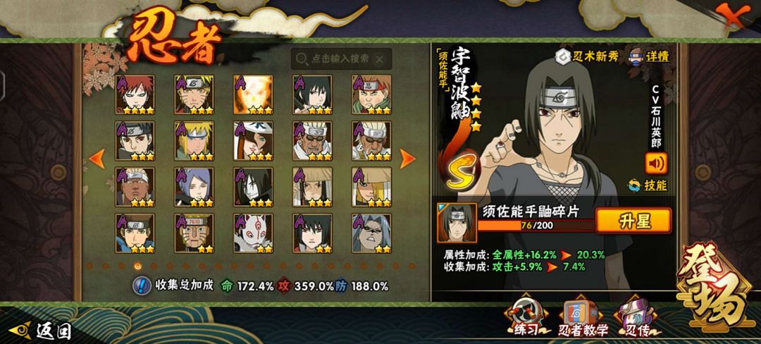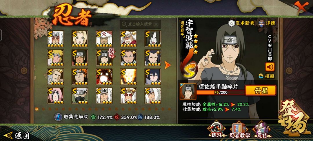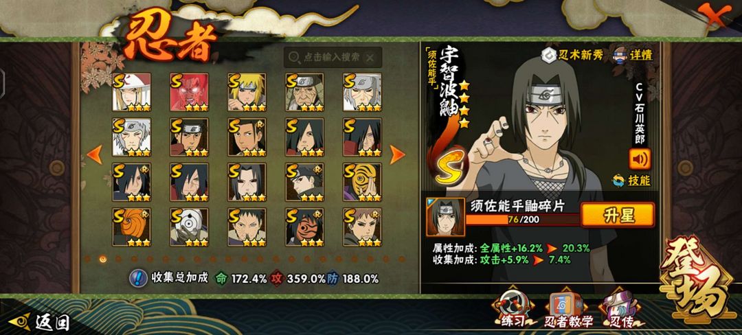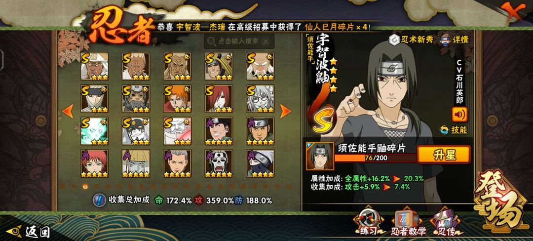 53s 86a,战力3704w,总共388忍者 暴怒第六尾漩涡鸣人,须佐能乎卡卡西,漂泊带土。