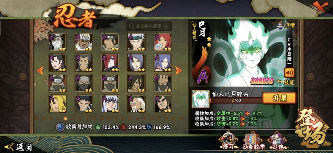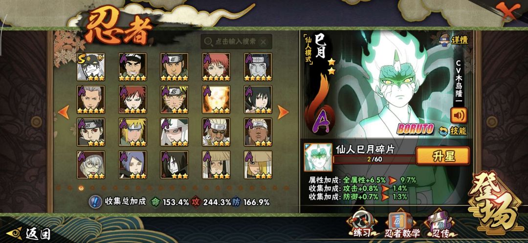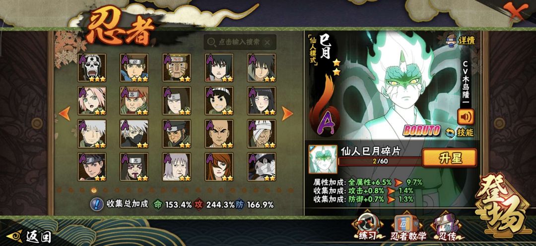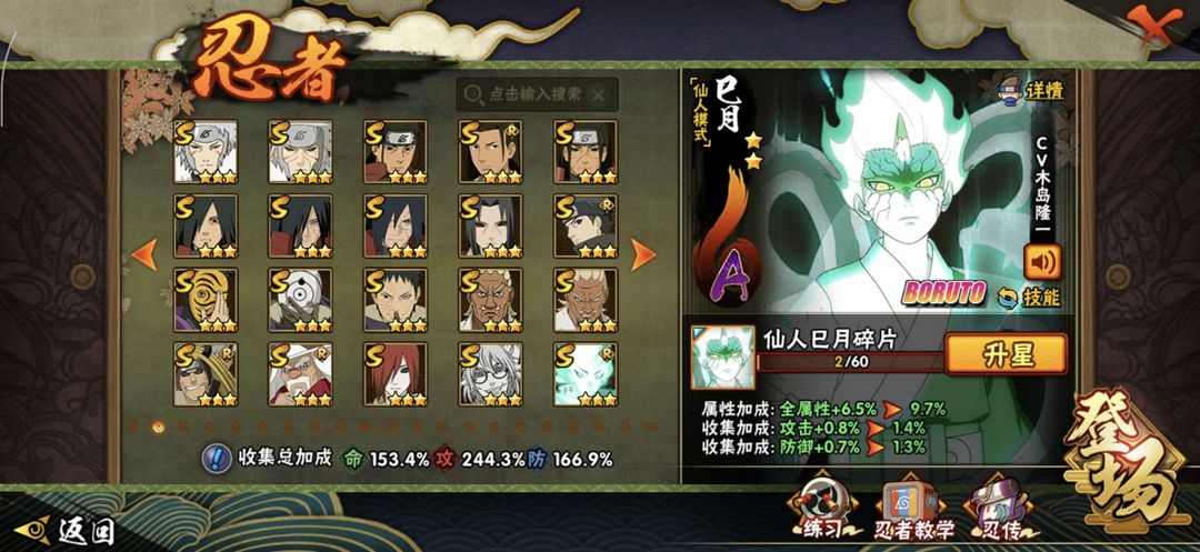 装备描述:41⭐️63a⭐️秽土再不斩⭐️大筒木桃式⭐️桃式博人⭐️解斑⭐️创立柱间⭐️漂泊小南⭐️漂泊扉间⭐️紫狗⭐️黄猿⭐️忍战艾⭐️忍战小李⭐️