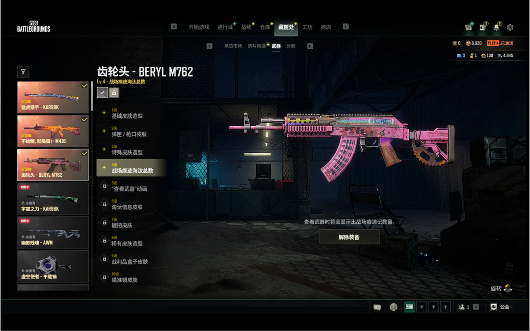 装备描述:可排位号双色阿斯顿马丁丶4级齿轮头762丶二级捣蛋m4猛虎98k金面超多绝版皮肤