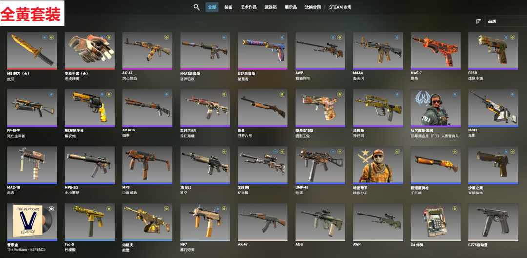 完美B+⭐M9虎牙⭐老虎精英⭐灼心怒焰AK47⭐破碎铅秋A1⭐猫狗大狙⭐满配全黄套
