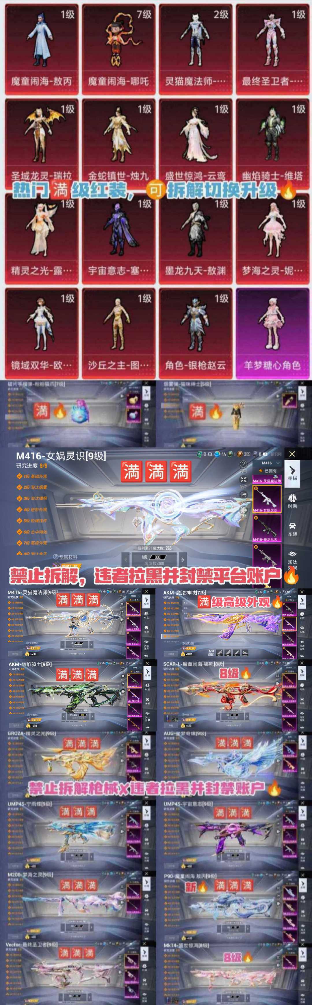 限制: 租号15次及以上 | 撤单率<30%才可租用此帐号装备描述:❤️拆解枪械载具永久拉黑,如果装备与图片描述不符请撤单,不要去拆解。 ⭐账号价值高,累计充值几十万,如开挂或使用第三方造成封号,按累计充值金额起诉赔偿,打官司追究到底。 ⭐⭐注意事项: 1、拆解枪械拉黑处理并上报封停平台账号!!! 2、禁止伤害队友、频繁逃跑游戏,违者永久拉黑。 3、如造成禁麦禁言,拉黑处理,请文明游戏。 4、订单由平台客服处理,号主无权处理,有问题咨询平台客服。 ❤️温馨提示: 感谢各位老板的支持!!!协助登录后不跳转到游戏,可能是延迟,请手动去游戏登录界面查看有无登录。如果没登录,请关闭和平精英重新打开更新后再重新协助登录。
