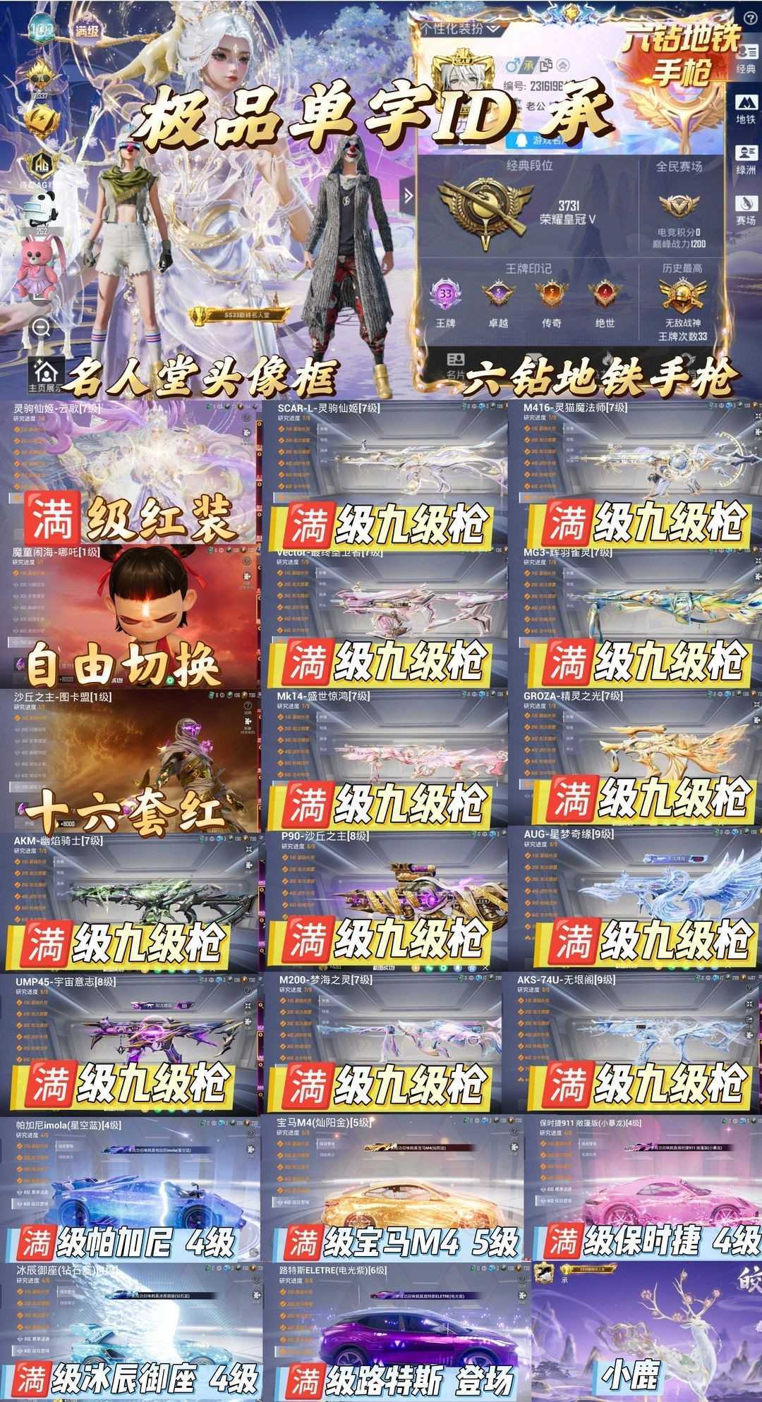 单字ID承/满级红驭风/云歌/名人堂头像框/地铁6钻武器/保时捷/宝马/帕加尼/星梦奇缘
