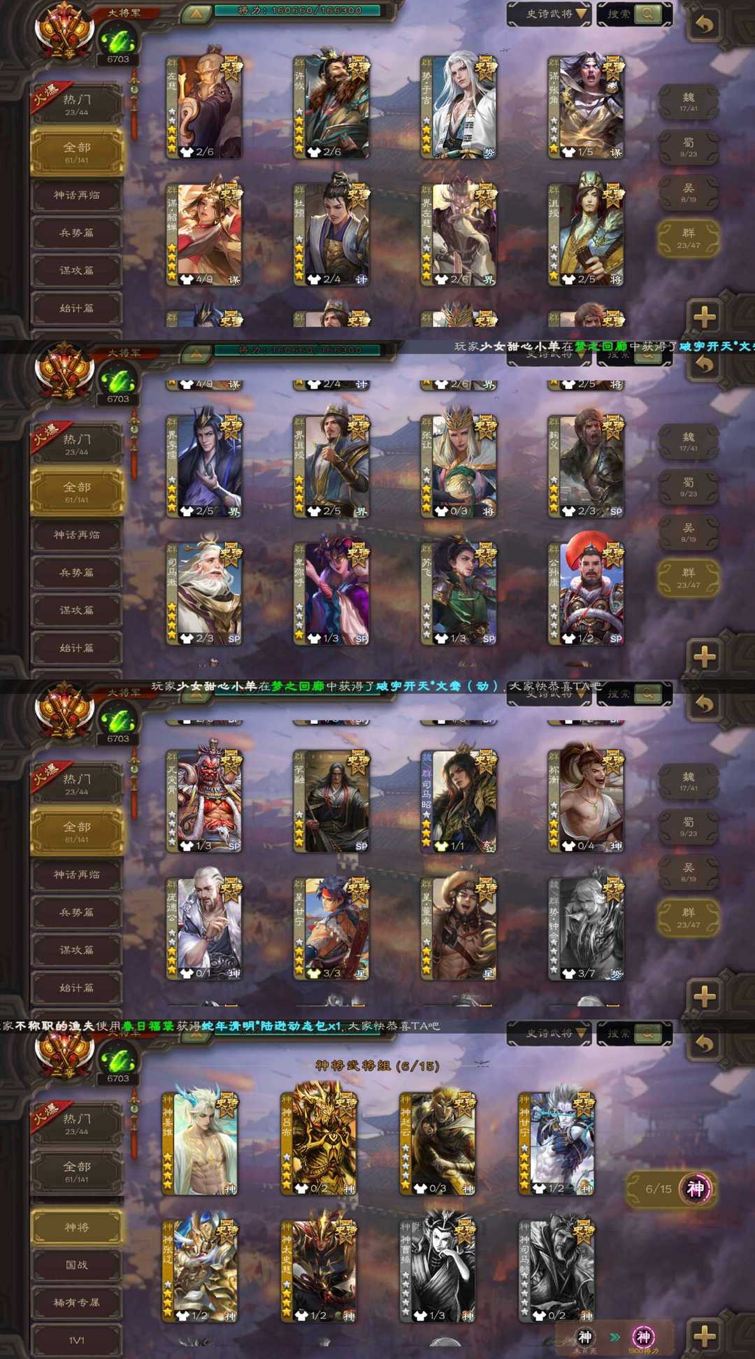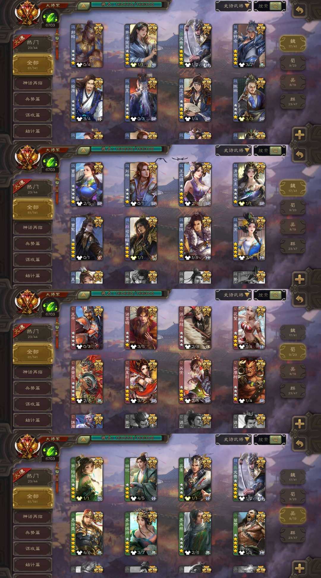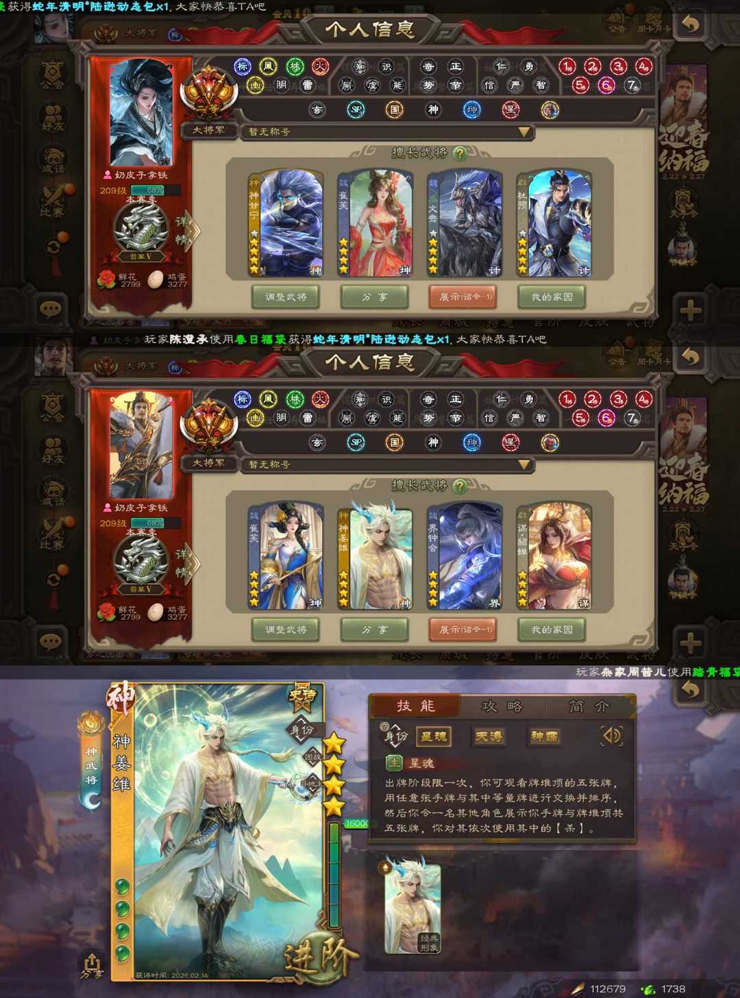 装备描述:二等大将军最新权一神姜维/三形态崔芙/强力农民势于吉/曹髦/笮融/界沮授/动态神甘宁/动态杜预/动态势辛宪英/动态势陆郁生/动态文鸯/潜蛟觊天双形态动态界钟会/动态谋貂蝉等史诗,有友徐庶,动态谋郭嘉,动态谋黄月英,动态谋荀彧,势孙韶等强力精品