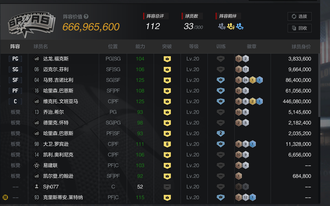 装备描述:马刺队套!满突文班亚马,满突历史巴恩斯,满突时刻吉诺比利,整个号都是马刺名宿