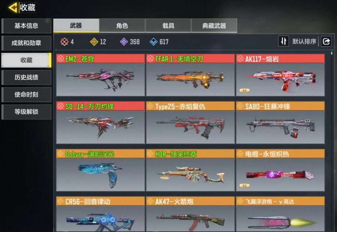 神话4个传说12个神话有EM2苍穹有FFAR1无尽空刃还有so14万刃作风然后道具有很多传说皮